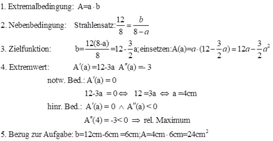 Aufgabe 6: Die Katheten eines rechtwinkligen Dreiecks sind 12 cm und 8 cm lang. Diesem Dreieck ist ein möglichst großes Rechteck einzubeschreiben, von dem zwei Seiten auf den Katheten des Dreiecks liegen.