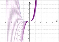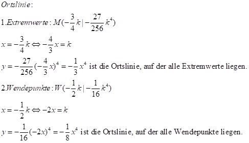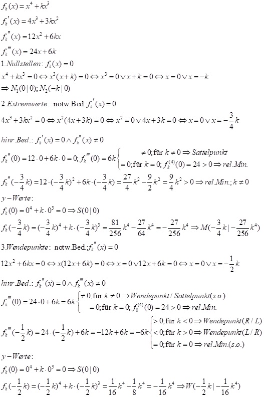 Aufgabe: Untersuche allgemein den Funktionsverlauf der Funktionsschar fk(x) = x4 + kx3. Bestimme zusätzlich die Ortslinien, auf denen die Extrempunkte und Wendepunkte liegen.