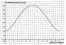Während einer Hochwasserwelle wurde in einer Stadt der Wasserstand h des hochwasserführenden Flusses in Abhängigkeit von der Zeit x gemessen. Die nebenstehende Graphik zeigt die graphische Darstellung der Messwerte. Der Funktionsterm der Funktion, die den zeitlichen Verlauf der Hochwasserwelle beschreibt, lautet: