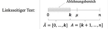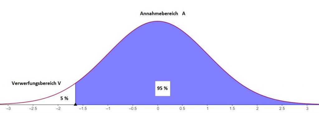 Bei einem linksseitigen Hypothesentest wird die Nullhypothese abgelehnt, wenn das Testergebnis kleiner als ein bestimmter Wert ist mit einem Signifikanzniveau α (in der Grafik ist α = 5%).