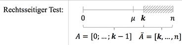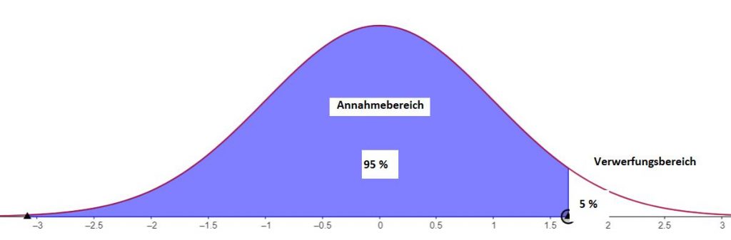 Bei einem rechtsseitigen Hypothesentest wird die Nullhypothese abgelehnt, wenn das Testergebnis größer als ein bestimmter Wert ist bei einem bestimmten Signifikanzniveau α (in der Grafik ist α = 5%).