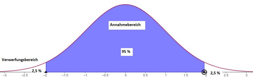 Nach dem Aufstellen der Nullhypothese muss der Annahme- und Ablehnungsbereich für das Testverfahren aufgestellt werden. Diese Bereiche sind nicht willkürlich zu wählen, man muss dazu ein Signifikanzniveau α festlegen, um zu entscheiden, ob ein Test signifikant vom Normalen abweicht. Ist das Signifikanzniveau 5%, so liegen 95% im Annahmebereich und nur 5% im Ablehnungs- bzw. Verwerfungsbereich.