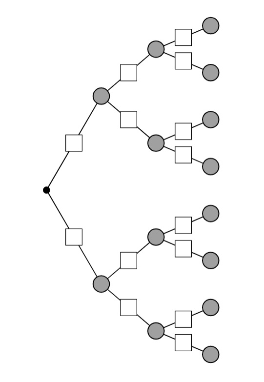 In die Kästen, d.h. an die Pfade werden die Wahrscheinlichkeiten dieses Ereignisses geschrieben. Am Ende eines Pfades steht dann die Wahrscheinlichkeit für diesen Pfad. Wie mit den Wahrscheinlichkeiten gerechnet wird, wird in der sogenannten Pfadregel beschrieben.
