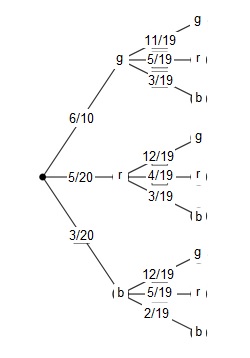 P((g,g))+P((r,r))+P((b,b)) = 6/10‧11/19+5/20‧4/19+3/20‧2/19