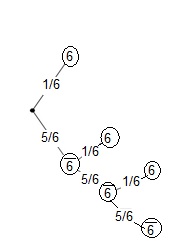 Hierbei kann man das Baumdiagramm nur teilweise zeichnen, da man nur die Äste benötigt, wo eine sechs gewürfelt wird. Fällt die sechs, so braucht man die weiteren Ausgänge nicht mehr betrachten.